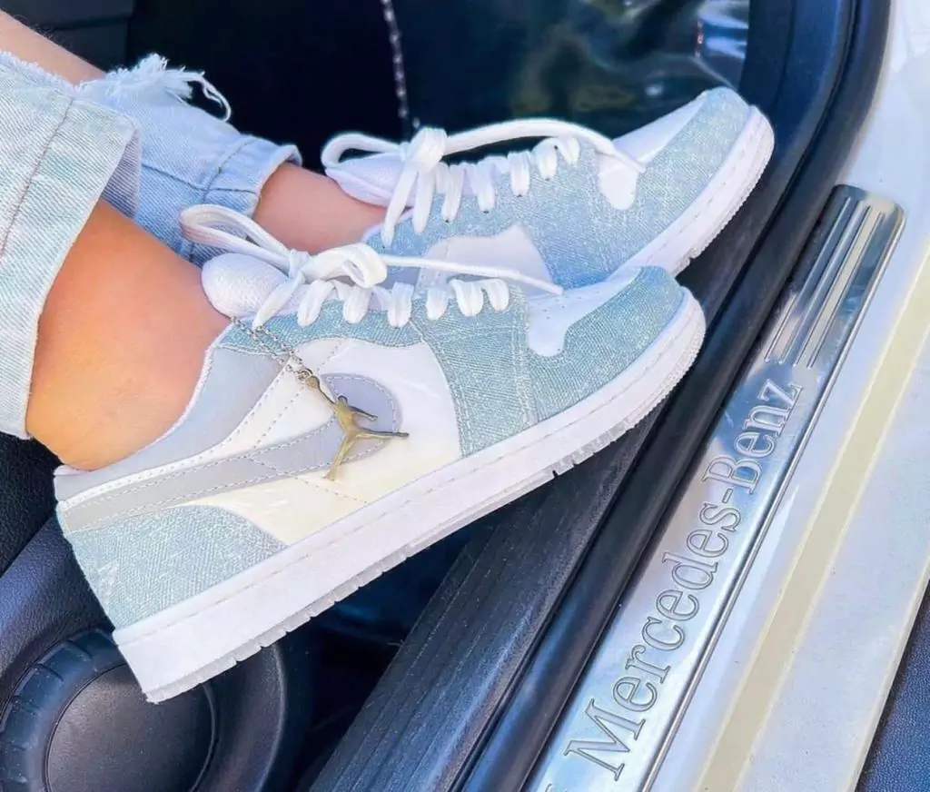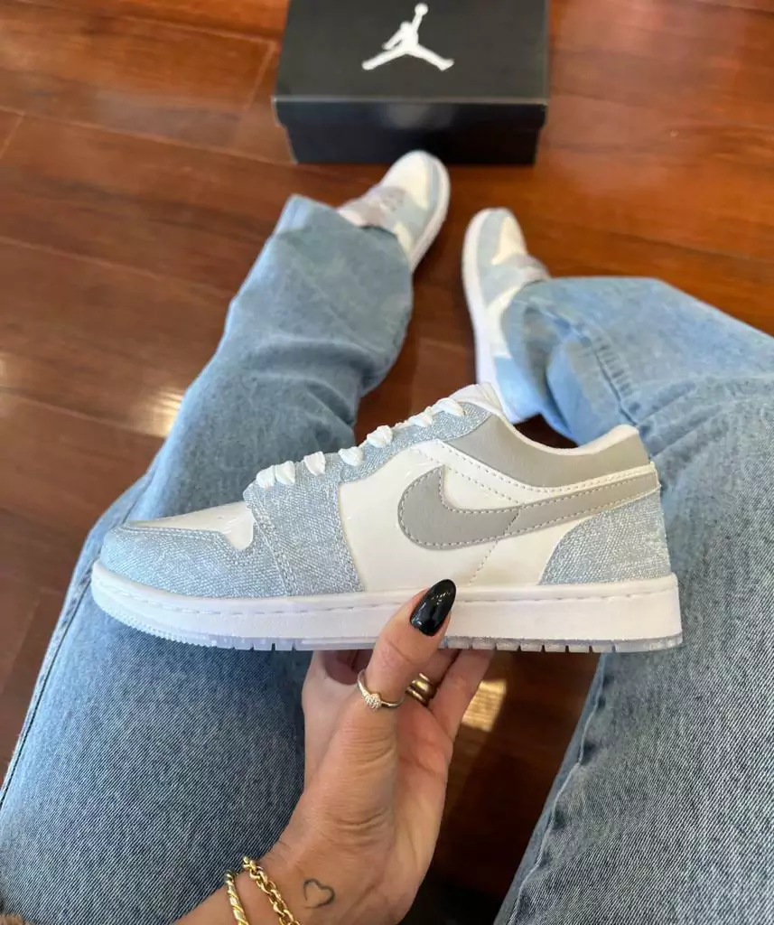 O cabedal desse Air Jordan é uma obra-prima em si mesmo, com detalhes azuis que brilham delicadamente com a luz, graças ao toque de glitter que acrescenta uma dimensão única ao tênis. Este detalhe não apenas eleva o apelo estético, mas também simboliza a individualidade e a atitude brilhante de quem o usa.