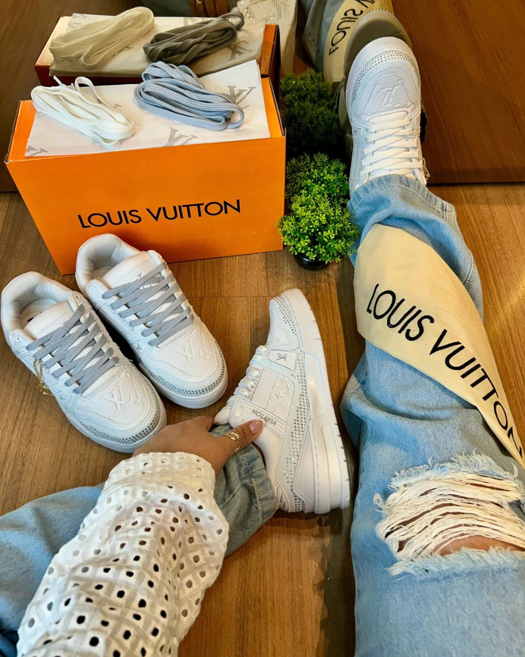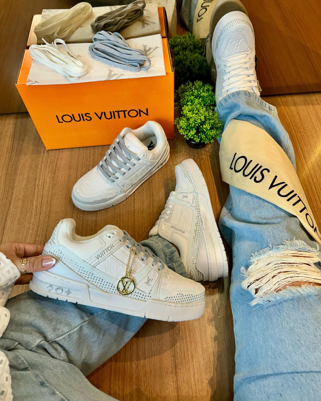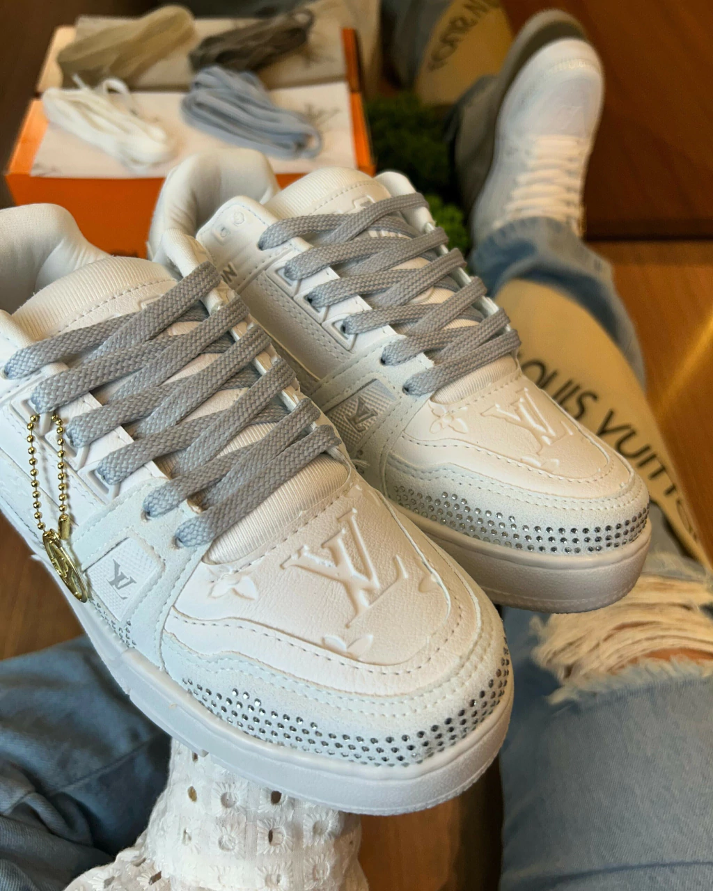 O LV Trainer Hot Fix é a combinação perfeita de luxo e streetwear, elevando o clássico Trainer a um novo nível de exclusividade. Feito em couro de alta qualidade, o modelo se destaca pelos detalhes em strass aplicados manualmente, criando um efeito brilhante e sofisticado. Inspirado nos icônicos tênis de basquete dos anos 90, ele apresenta um design robusto e moderno, com solado de borracha que garante conforto e durabilidade. O monograma LV sutilmente inserido reforça a identidade da marca, tornando esse sneaker uma verdadeira obra-prima para quem busca estilo e exclusividade.